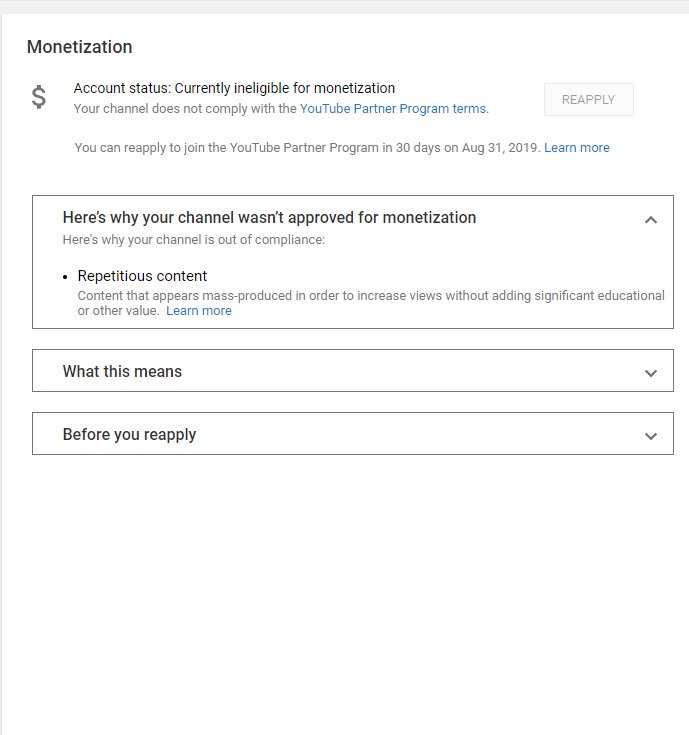 @TeamYouTube Hi. two times, my channel https://www.youtube.com/channel/UCtkFfHYC_8JhspqQAWSLzGQ …) http://youtube.com/channel/UCtkFf … was monetized, but in a few days, YT demonetized it again. (15 June-monetized; 21 June-demonetized and now in July 2019 - 30 July-monetized; 1 august-demonetized). Screens bellow. Pls check.pic.twitter.com/upDoDuqf4k