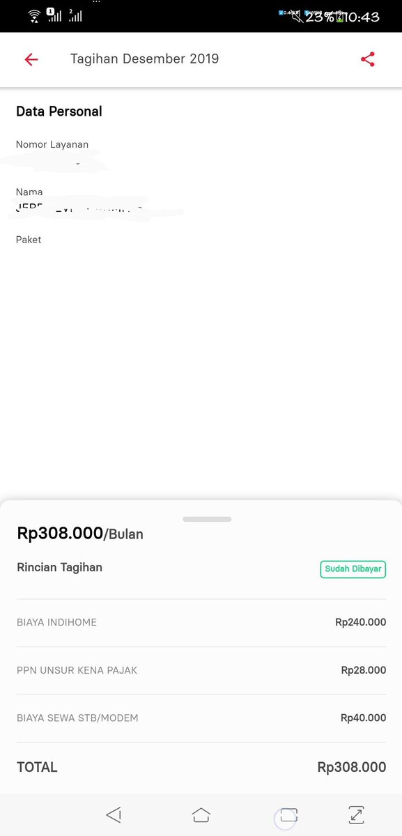 tagihan desember 2019 Rp.308.000 tapi tagihan januari 2020 Rp.311.000 naik 3k karena ada biaya meterai sedangkan di email cuma Rp. 308000