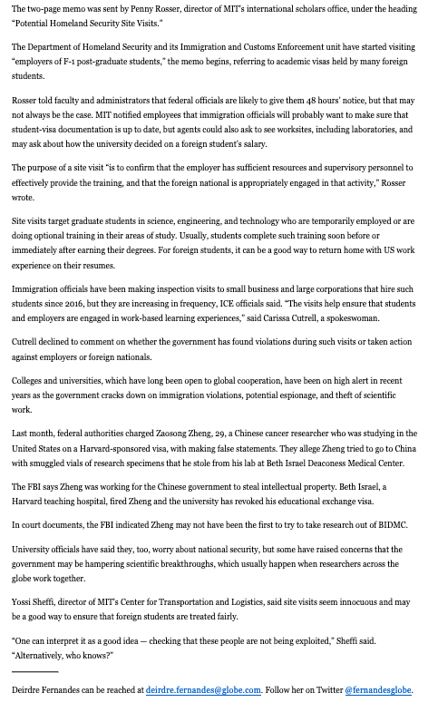 Some people outside US can't access the article about MIT and ICE. Try this Boston Globe article instead, which has more information anyway. I've also copy/pasted the content of the Globe piece below. https://www.bostonglobe.com/metro/2020/01/09/mit-expecting-visits-from-immigration-officials/8PiSssRNsHKjdB6bwRlaLN/story.html … https://twitter.com/KimZetter/status/1215711307946545153 …pic.twitter.com/6Oj6RUb4Vx