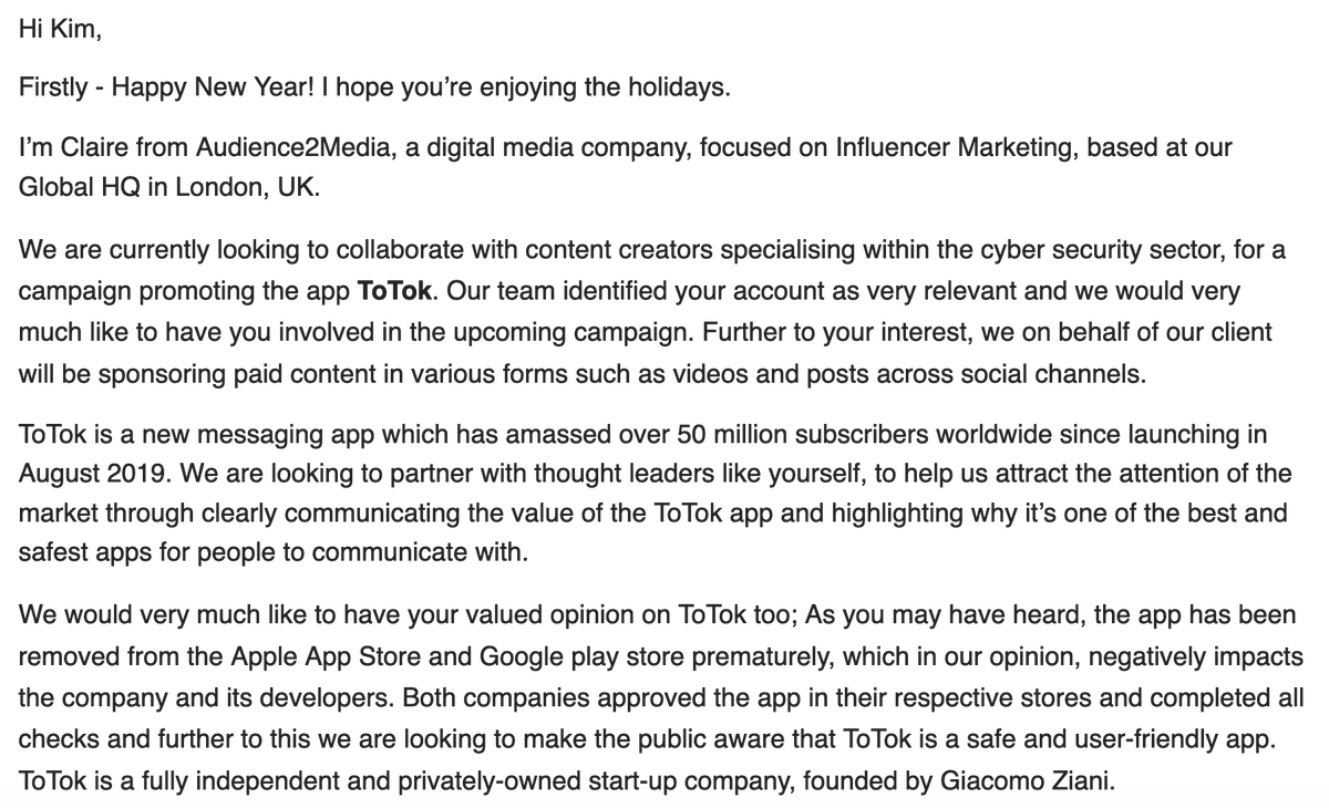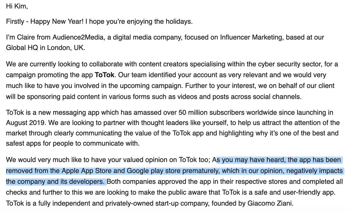 ToTok, the chat app that was recently exposed as a United Arab Emirates spy tool (and is now banned from Apple and Google app stores) is on a campaign to convince you its app is ok. This is the quid-pro-quo email I received seeking to pay me to promote it. https://www.nytimes.com/2019/12/22/us/politics/totok-app-uae.html …pic.twitter.com/4ceO9G0QwH