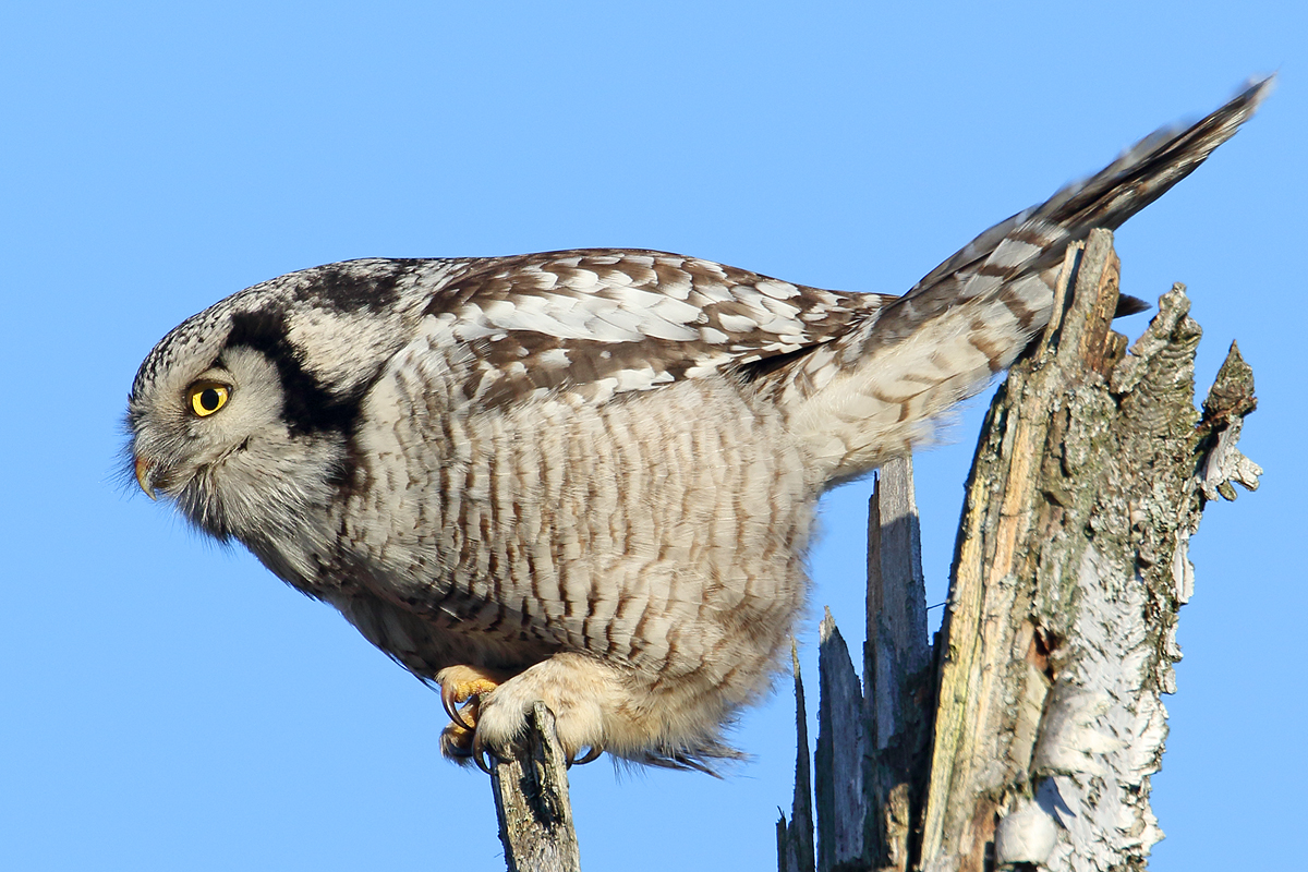Hökuggla. A rather obliging Hawk Owl in Västmanland, Sweden, yesterday