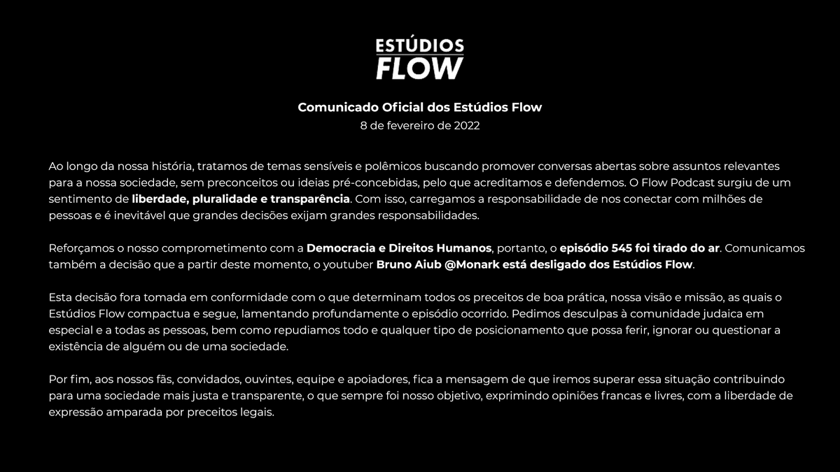 Comunicado oficial Informamos que a equipe do Wolf Team está de acordo com o posicionamento dos Estúdios Flow. Reiteramos que somos contra qualquer tipo de pensamento que viole a Democracia e os Direitos Humanos.pic.twitter.com/B1hwHvQtKa
