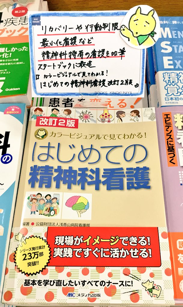 【新刊】新人ナースに必要な知識や情報をまとめた精神科看護のスタートブックが改訂!『カラービジュアルで見てわかる! はじめての精神科看護 改訂2版』(メディカ出版)最新情報やなぜ精神疾患患者に合併症が多いかなどの基礎理論・技術を加筆、新人さんのみならず現場でお困りの全ナースに!D16棚。ctpic.twitter.com/Omp8aL35hQ