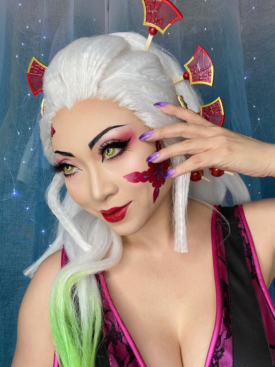 Wig by @sayakatcosplay Hair pins by@PlexiCosplay Face tattoo design by@KinpatsuCosplay Contacts by@askUNIQSO Costume & makeup by me#DemonSlayer#kimetsunoyaiba#鬼滅の刃pic.twitter.com/eG6qstnTti