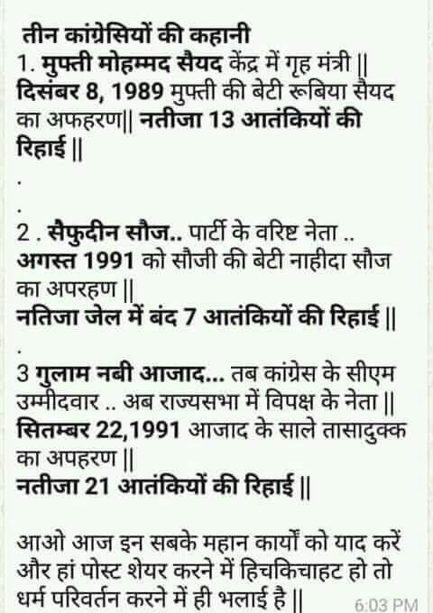 @INCIndia नेताओं की गलती नहीं मानते क्योंकि यह नीव तो खुद मणिशंकर अय्यर सलमान खुर्शीद@digvijaya_28 गुलाम नबी आजाद इन्होंने हमेशा आतंकवाद का समर्थन किया है भारत में रहते हुए वह यह तो कांग्रेस के DNA में है इसमें किसी भी बात का अफसोस नहीं हैThanks. Twitter will use this to make your timeline better. UndoUndo