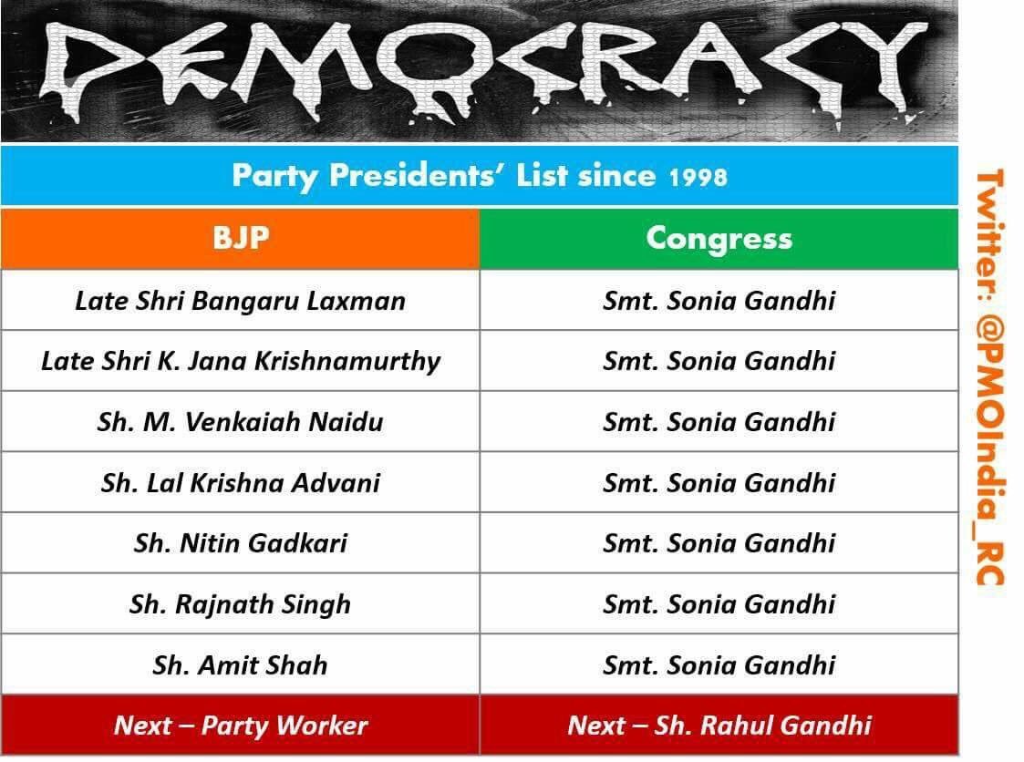 36/70 @INCIndia had a Nehru-Gandhi clan President, other 34/70 their stooges have lead the party. In comparison @BJP4India is a truely democratic party.