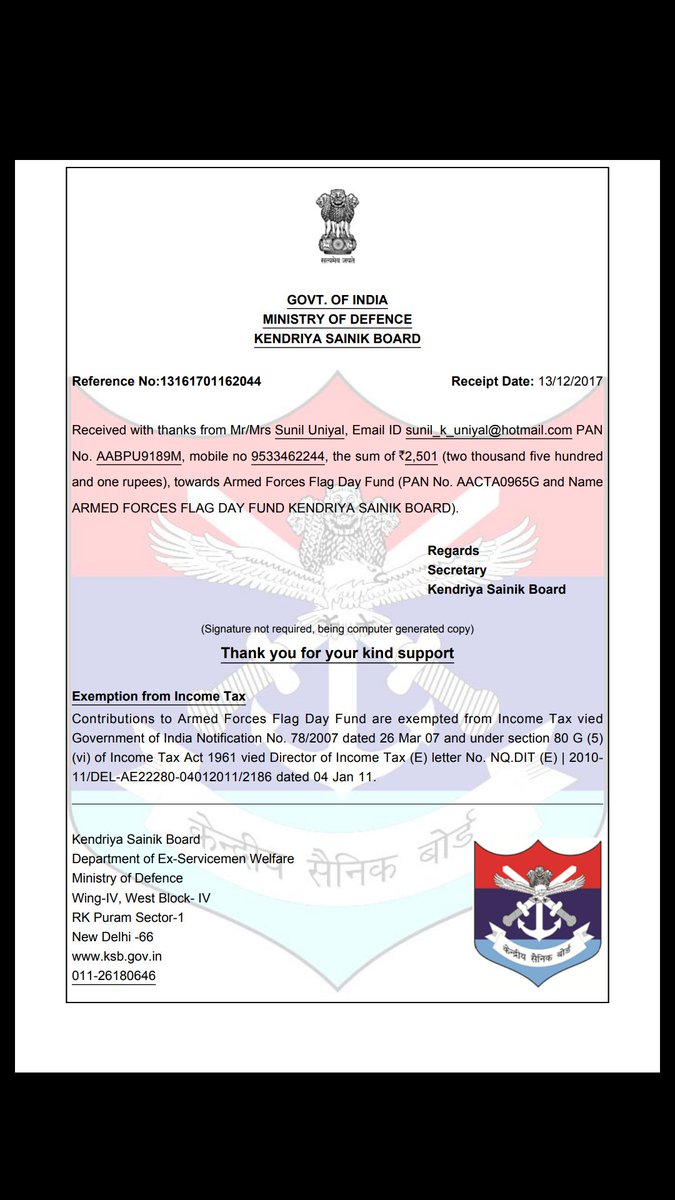 As a Serving Army Officer, I feel glad to contribute Rs 2,501/- towards our Armed Forces Veterans, their families & War Widows on the eve of Indian Armed Force Flag Day. Same I have promoted & requested others in my FB to support for the cause.. https://m.facebook.com/story.php?story_fbid=10210026050476310&id=1487651675 … Jai Hind.pic.twitter.com/hBiT3LTx9D