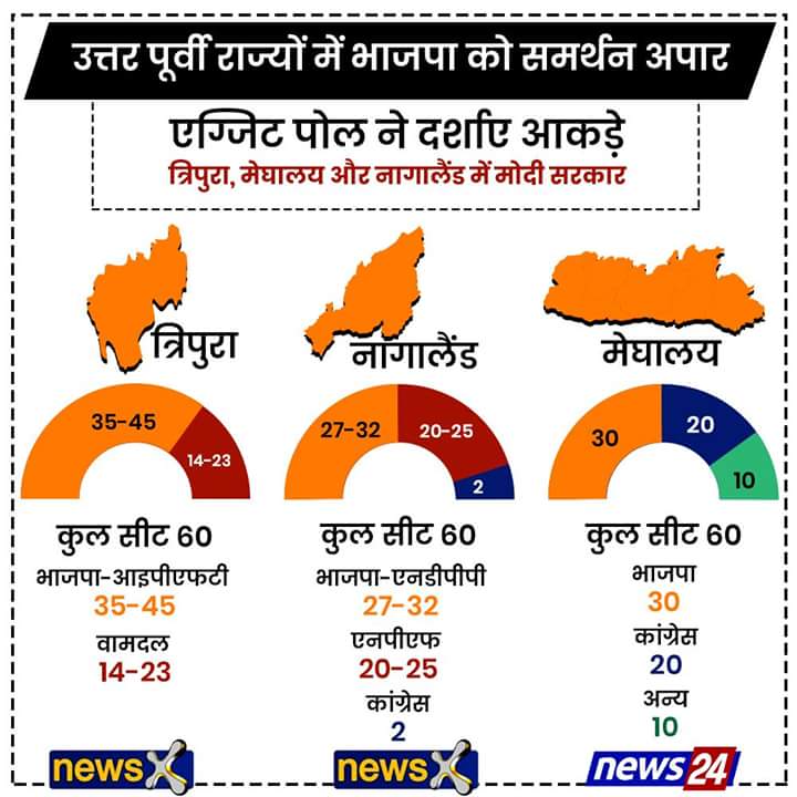 BJP = 44 से 50 लेफ़्ट फ़्रंट = 9 से 15 कांग्रेस समेत अन्य = 0 से 3 त्रिपुरा में ‘ऐक्सिस माई इंडिया’ का एग्ज़िट पोल जय जय