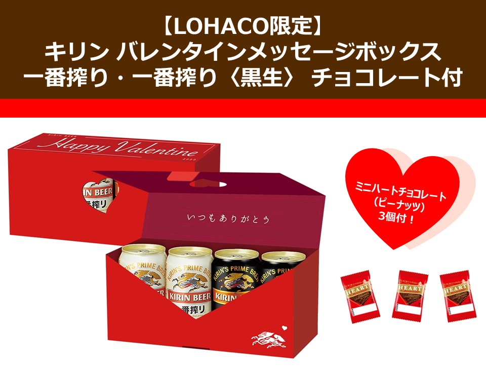 【一番搾り】と【一番搾り〈黒生〉】計4本に、チョコ3個付のギフトボックス