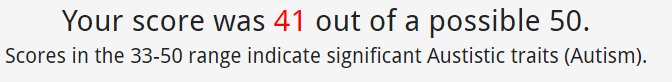 "Your score was 31 out of a possible 50. Scores in the 26-32 range indicate some Autistic traits (Aspergers Syndrome)." Congrats me!