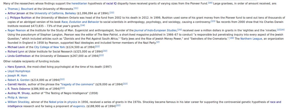 Reminder that the much maligned Pioneer Fund's list of research grant recipients looks like a list of who's cool in behavioral genetics and IQ. They funded them when no one else would at a time of need against political attacks. https://en.wikipedia.org/wiki/Pioneer_Fund#Recipients_of_funding … pic.twitter.com/1sBKALvzez