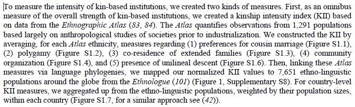 firstly, their kinship intensity index comprises five, not three, things: cuz marriage, polygamy, extended families, community organization (clans, etc.), and unilineal descent...pic.twitter.com/LULtFY1bcC
