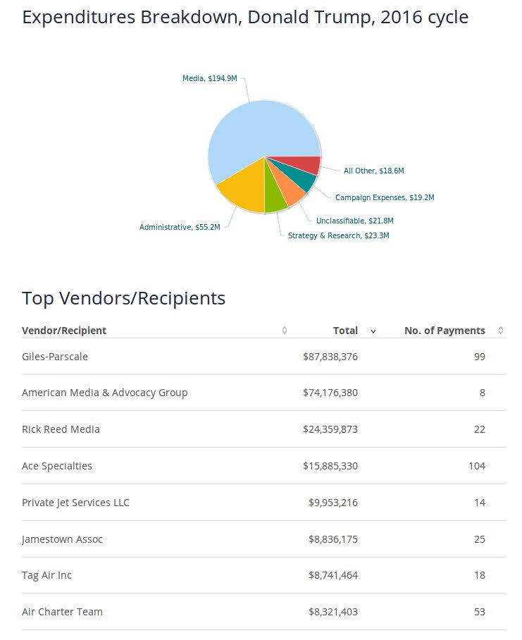 Looks like about 55% are spent on media. https://www.opensecrets.org/pres16/expenditures?id=N00023864 … https://www.opensecrets.org/pres16/expenditures?id=N00000019 …pic.twitter.com/YrBjz1gDvF