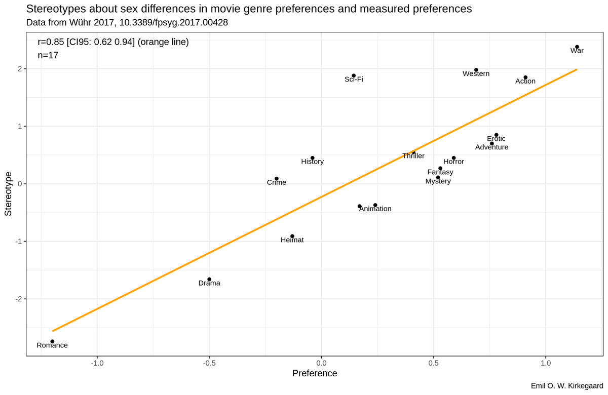 The study didn't really properly showcase the amazing accuracy of sex stereotypes, so I will help them. r = .85! Not even reported in the paper bc weird ANOVA approach. Sex stereotypes are useful. If you invite a date for a movie, they are a good guide. https://www.frontiersin.org/articles/10.3389/fpsyg.2017.00428/full …pic.twitter.com/NDJJmEVZYO