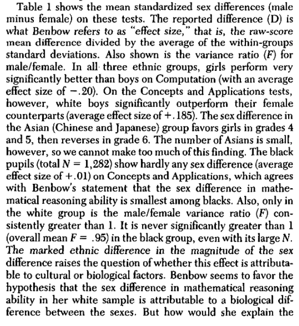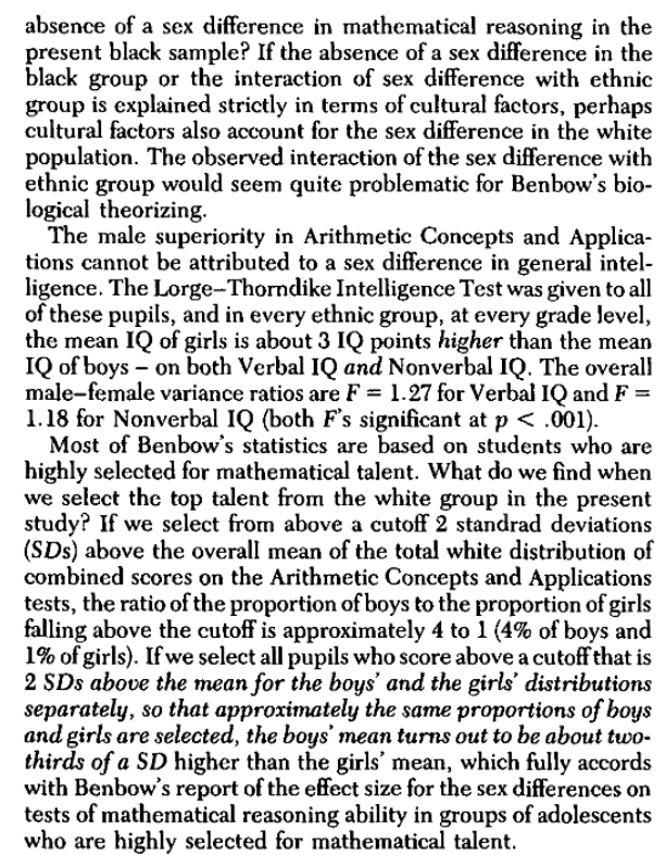 That one time when Arthur Jensen criticized a biological hypothesis -- by Camilla Benbow on the origins of the sex difference in math ability among European-descent. Note the math breakdown: girls are better at computation, but worse as math reasoning. http://arthurjensen.net/wp-content/uploads/2014/06/Sex-Differences-in-Arithmetic-Computation-and-Reasoning-in-Prepubertal-Boys-and-Girls-1988-by-Arthur-Robert-Jensen.pdf …pic.twitter.com/ENP82kiYFM
