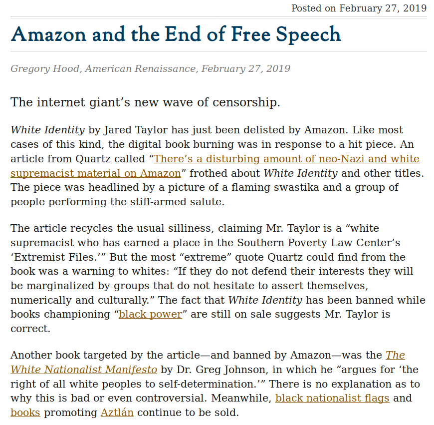 Amazon used to be relatively immune to censorship, but seems to be caving. Taylor was also purged from @Twitter, perhaps because his polite, academic tone is seen as more likely to get traction than more extreme voices.
