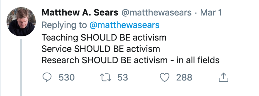 Well I’m replying to a tweet that quote tweets a subtweet of Sears so I can’t claim to know what he really means. The way I see it, these are inescapably non-neutral activities: the only choices are to hide it or embrace it, and preferably one should do the latter.
