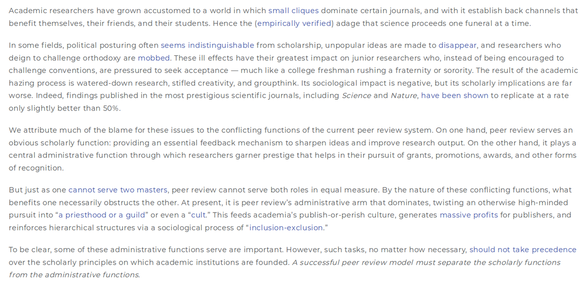 Considering the 1) time cost, 2) ineffectiveness to improve quality, 3) biases of peer review -- perhaps we should just bite the gold OA bullet: aim to maximize use of low-cost OA commercial publishers who get the ball rolling on slow reviewers. https://heterodoxacademy.org/diversity-peer-review-purpose/ …pic.twitter.com/WBobwjPuD3