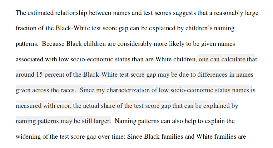 Figlio was able to find quite good evidence of (teacher) expectations in a huge Florida dataset using a within family comparison model. But these effect sizes! Choosing a bad name for one kid might result in ~1 centile worse test score. https://www.nber.org/papers/w11195 pic.twitter.com/3p8KidTT5C