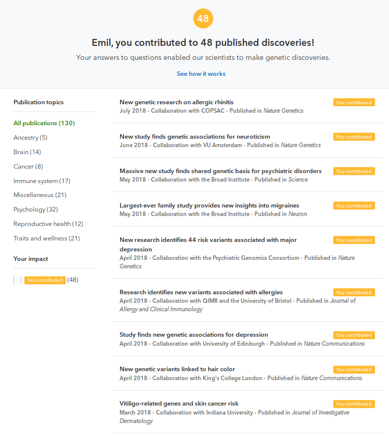 Pretty cool. On 23andme, can see all research cohorts one is part of. Apparently, my data is part of 48 publishes studies so far. 23andme should look into a GWAS for contributing to science in this way, a measure of science participation/citizenship. #citizenscience #genomicspic.twitter.com/TxAuhJAfOF