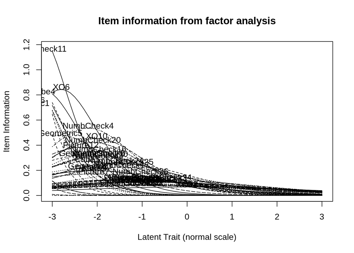 Look at the item analysis plot. Almost all the items are most informative for -3 z subjects, meaning they suffer from extreme floor effects. Warne et al should try administering this test battery to like 6th graders.pic.twitter.com/dzoJnedIFl