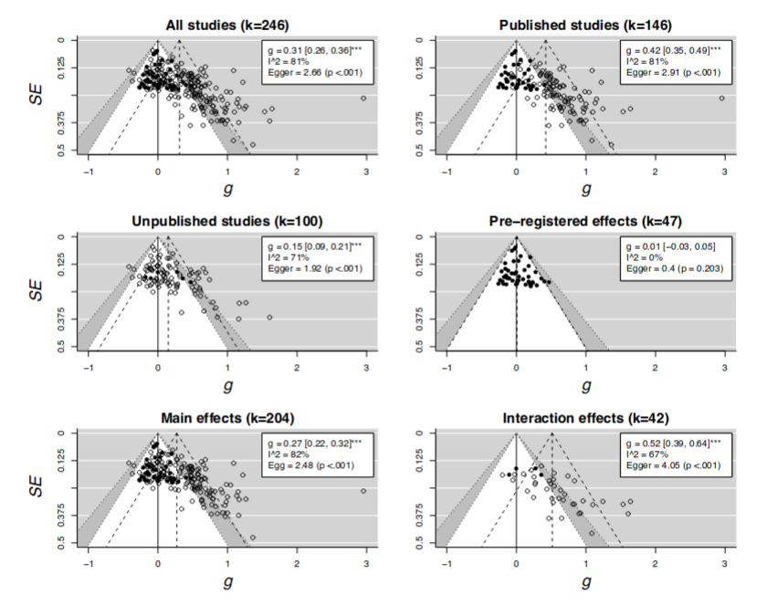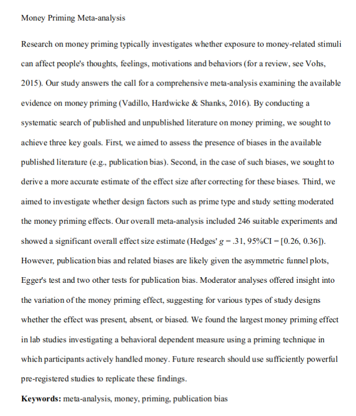 Great new meta-analysis on money #priming by Lodder et al (with @JelteWicherts). Results will shock you! Just kidding, results are basically what skeptics would expect. ZERO effect size seen in pre-reg studies! (k=47) + obvious indications of pub bias. https://pure.uvt.nl/ws/portalfiles/portal/29126856/Lodder_et_al._2019_A_Comprehensive_Meta_analysis_of_Money_Priming.pdf …pic.twitter.com/64iVQ4ZRi1