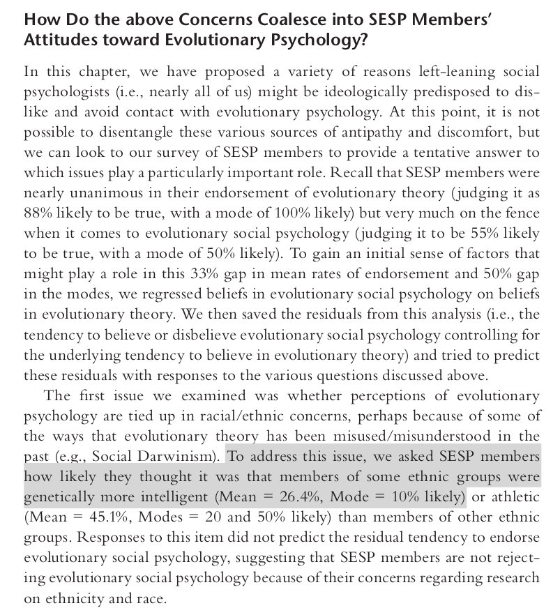 On the fake consensus against genetic contributions to race/ethnic gaps in intelligence. Even among social psychologists, the mean probability of genetics making a contribution is 26%! Badly phrased question, but shows that popular statements suffer form false consensus bias.pic.twitter.com/3rs8PbnhCV