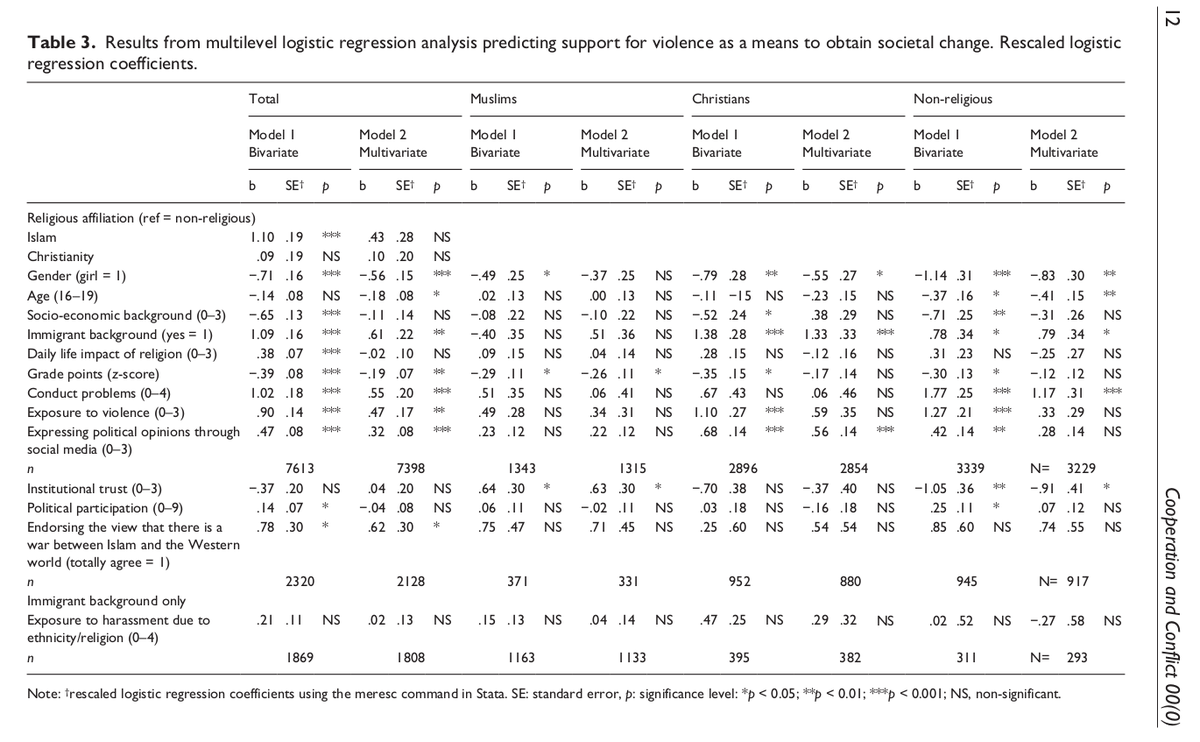 Study of 8,627 youths is Norwegian capital of Oslo finds that Muslims are 2.5x as likely to support using violence to obtain social goals i.e. pol. terrorism. Though one can make it non-sig. by adding a bunch of covariates in Everest style regression. https://journals.sagepub.com/doi/abs/10.1177/0010836717716721 …pic.twitter.com/CFyBZeZPa8