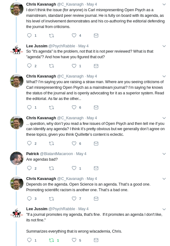 Not really. He's missing the point. What Kavanagh calls "scientific racism" is in fact the truth. That's why the Open Psych journals aren't bad. It's true that agendas can be bad; this one isn't.