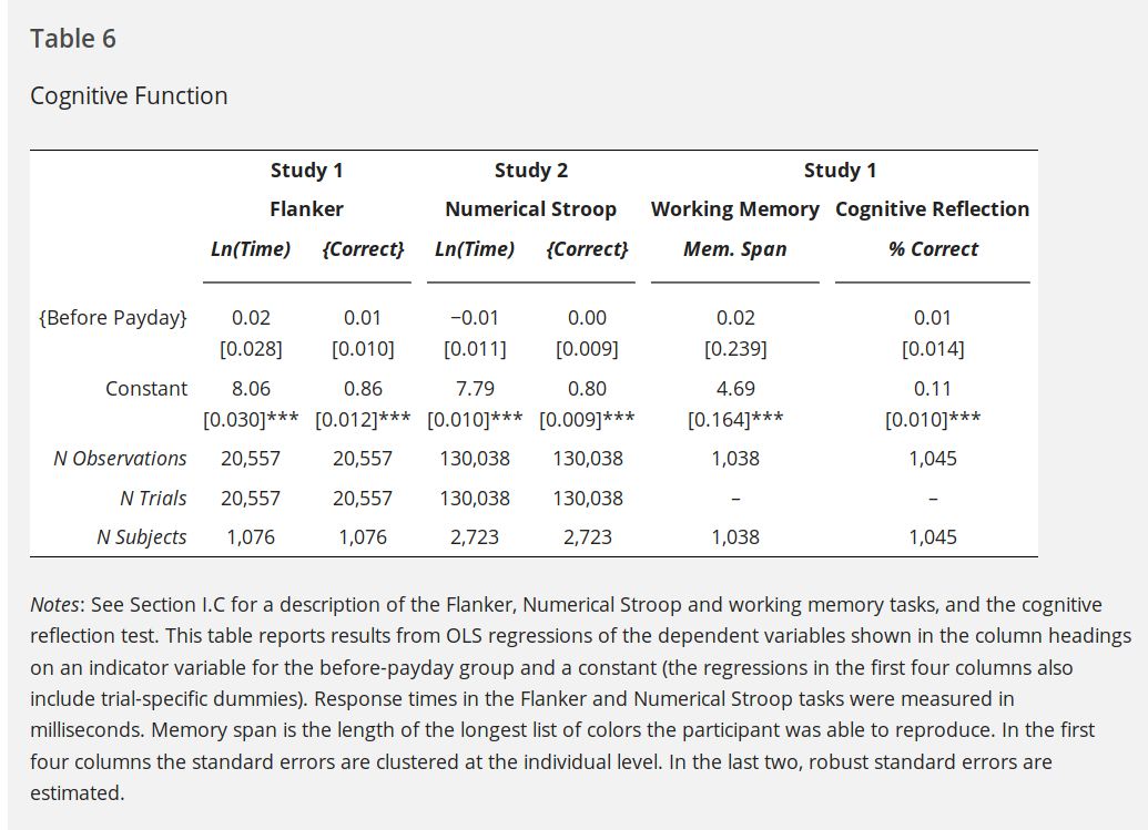 So, poverty makes you bad at reasoning right? According to tiny, social psychologist study. Here's a nice economics replication of sorts, using surveys administered before or after payday. Finds no effect on cognition, slight effect on discounting rate. http://europepmc.org/articles/pmc5167530 …pic.twitter.com/YqbgspKAGW