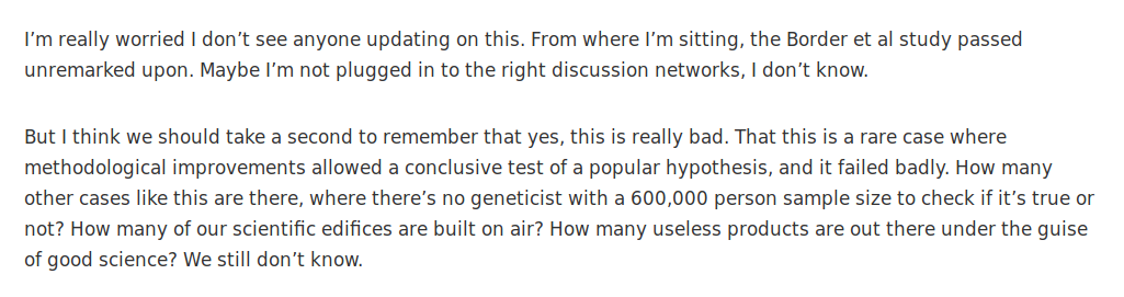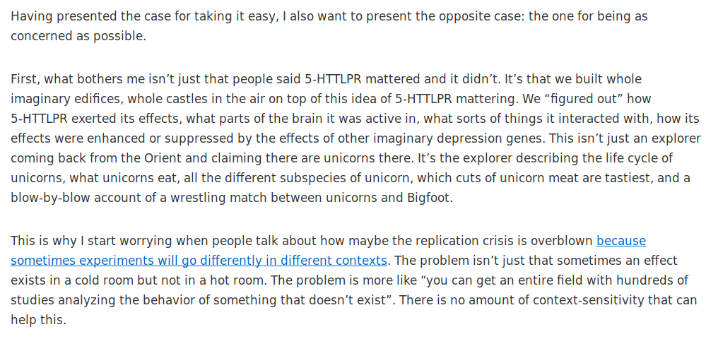 Funny and true review in Slatestarcodex on the history of 5-HTTLPR research. TL;DR for decades, there were 1000s of papers and millions of $ spent on researching this loci and its relations to psychiatric issues. And it was all basically self-delusion. https://slatestarcodex.com/2019/05/07/5-httlpr-a-pointed-review/ …pic.twitter.com/fLUuYLqjdY