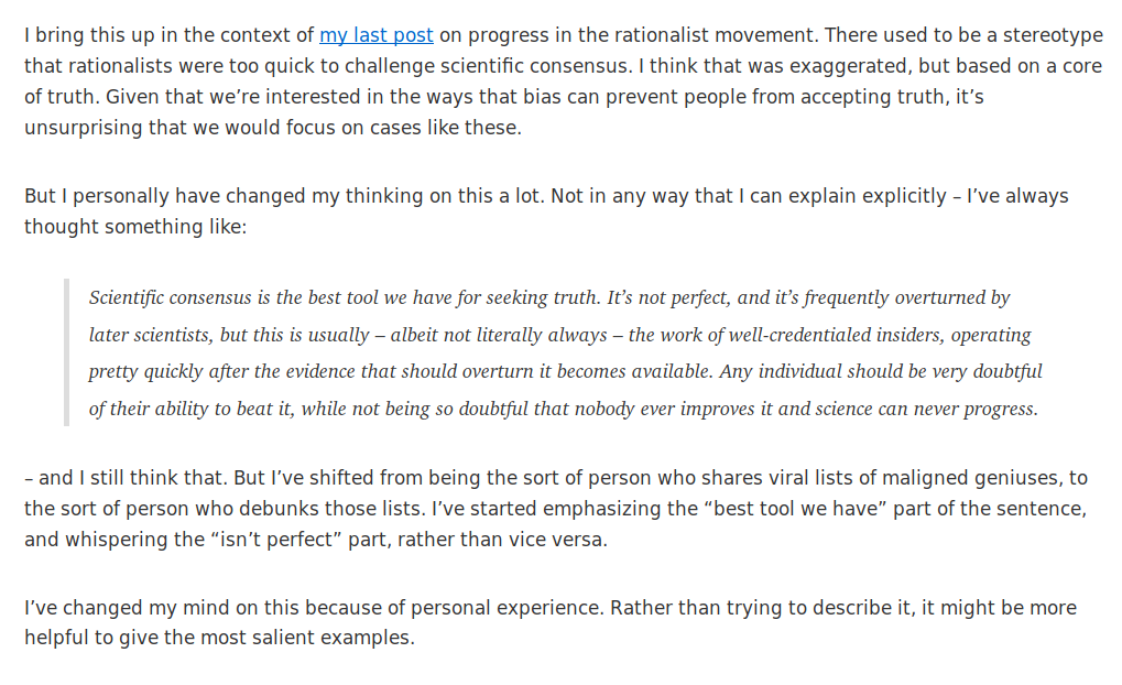 Contrast with Scott's post from 2017. He can't help but go looking for contrarian results. https://slatestarcodex.com/2017/04/17/learning-to-love-scientific-consensus/ …pic.twitter.com/sSNWJNwy6u