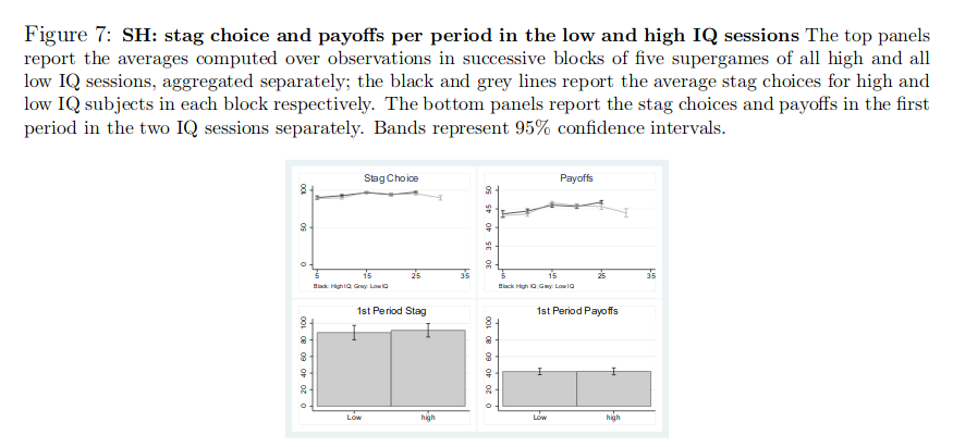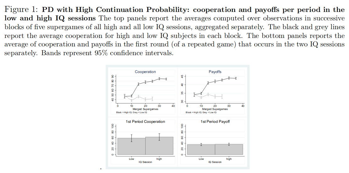 Another study on intelligence and cooperation in various economic games (prisoner's dilemma etc.). Finds some positive results in games involving trade-offs with repeated games. n = 110ish students, split into high and low groups based on 15 min Raven's. https://www.journals.uchicago.edu/doi/pdfplus/10.1086/701355 …pic.twitter.com/RAwAsZ45c4