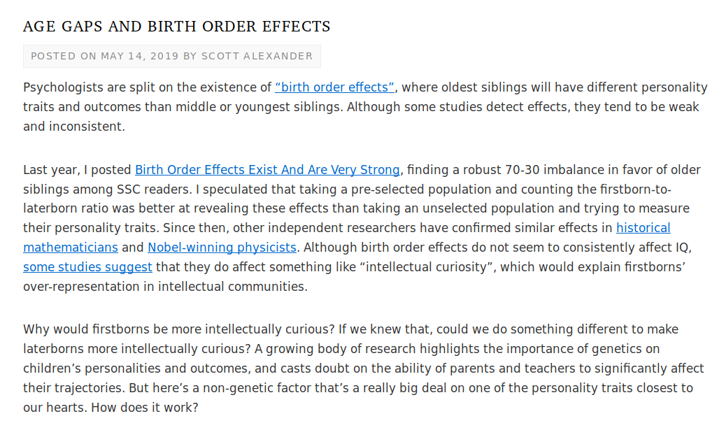 Less Wrongers finally doing some nice social science. Birth order effects seemingly vindicated after all for high thinking type people. My money is on hormonal theory (check for sex of sib effects) (True to stereotype, I am also firstborn w 1 brother.) https://slatestarcodex.com/2019/05/14/age-gaps-and-birth-order-effects/ …pic.twitter.com/VX1GIWBXaf