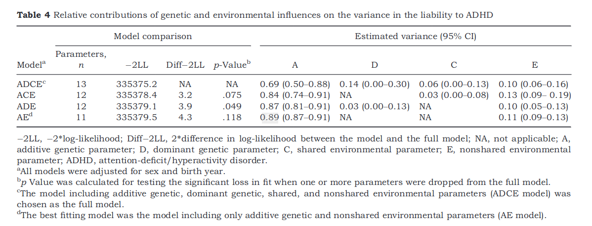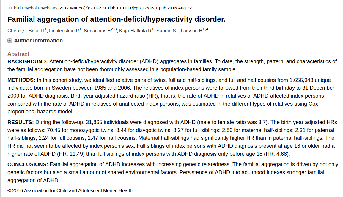 Amazing study of familial aggregation of ADHD from Swedish register data. Looks at ADHD concordance in diagnosis status using: monozygotic twins, dizygotic twins, regular siblings, half-siblings, cousins, & half-cousins. All converge on ~90% heritability. https://www.ncbi.nlm.nih.gov/pubmed/27545745 pic.twitter.com/dCcfieqLzN