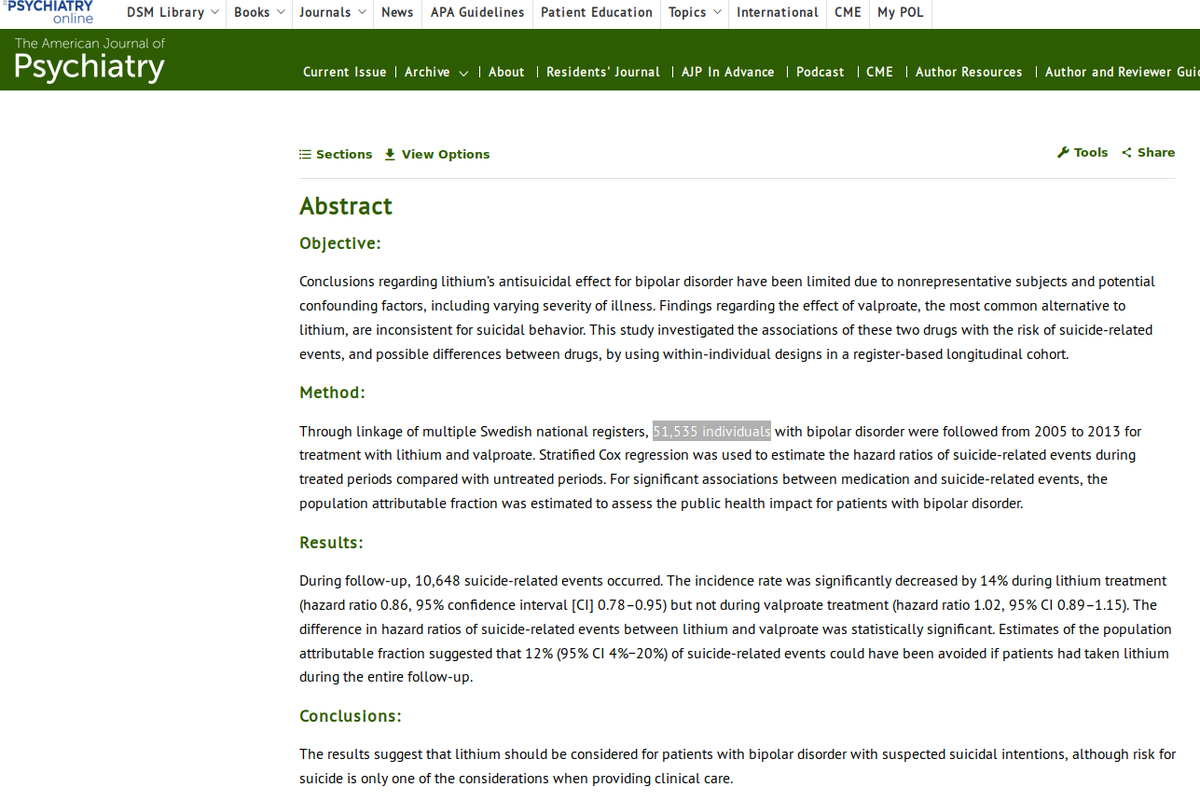 Study of 50k Swedes finds that using within person design (great!) shows that lithium prevents suicide events among bipolar people, and the commonly prescribed treatment Valproate doesn't appear to do anything. These kinds of studies should be automated. https://ajp.psychiatryonline.org/doi/full/10.1176/appi.ajp.2017.16050542 …pic.twitter.com/LpETlVW5eR