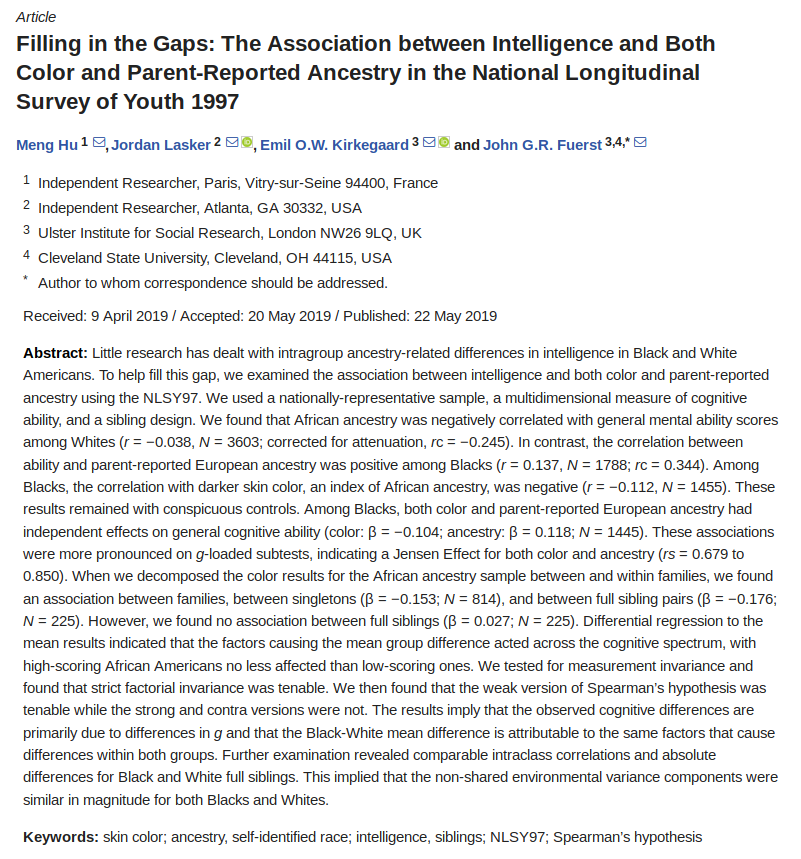 New article out. We confirm that skin color predicts IQ, BUT this only works between families, not within. This is a prediction from genetic model, non-genetic model predicts the opposite. Colorism has generally been contradicted by informative studies. https://www.mdpi.com/2624-8611/1/1/17/htm …pic.twitter.com/QOP6u89VV0