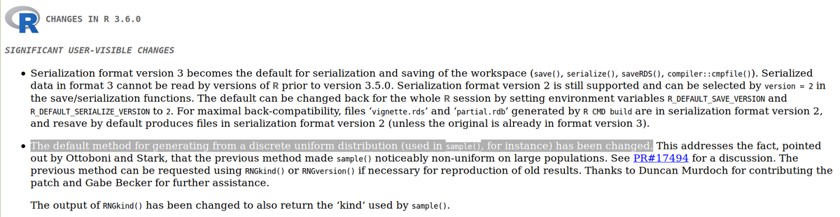 If you're wondering why your old #rstats scripts no longer produce exactly the same output, it can be because of very subtle stuff like changing the sampling algorithm in base R. https://cran.r-project.org/doc/manuals/r-devel/NEWS.html … pic.twitter.com/bPYWT7nxzY