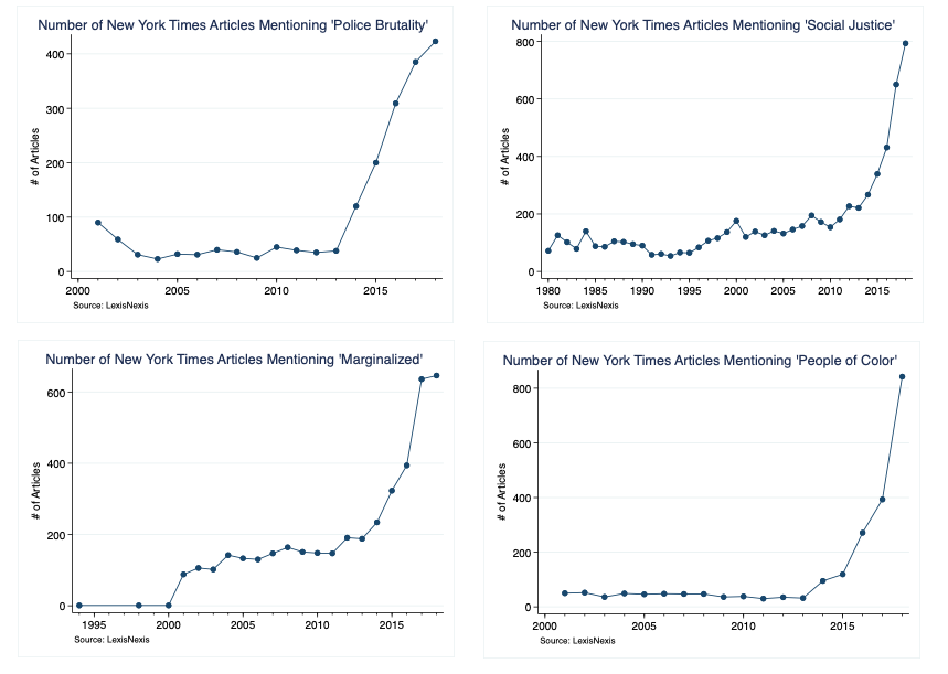 Number of New York Times articles mentioning phrases ● Police Brutality ● Social Justice ● Marginalized ● People of Color Very large increase in (very) recent years. See thread by @ZachG932 for much more on these word trends: https://twitter.com/ZachG932/status/1133440945201061888 …pic.twitter.com/xvIkLE40p2