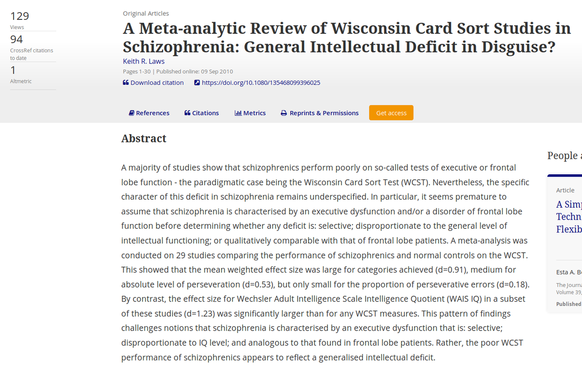 Apparently, some researchers think that schizophrenia is particularly marked by bad executive or frontal lobe function. However, review shows that it makes more sense to think of them just having lower intelligence in general. TL;DR don't forget g. https://www.tandfonline.com/doi/abs/10.1080/135468099396025 …pic.twitter.com/2gQhqb5Z0N