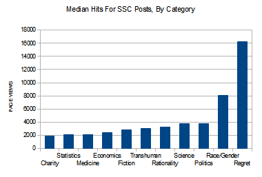 Views on SlateStarCodex blog by category. By reader demand, Scott, you need to write more regrettable posts on race/gender. PS. No one cares about charity. https://www.reddit.com/r/slatestarcodex/comments/bzuzgq/how_did_ssc_get_its_following/eqykrac/ …pic.twitter.com/Enkp7Cxf3Q