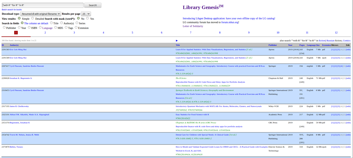 Often when deciding what #rstats methods book to read next, I just check the newest books on LibGen like this. Often results in some interesting reading in far off field.