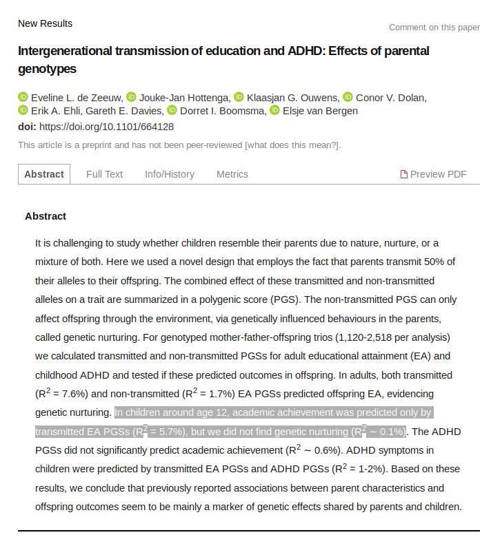 @KirkegaardEmil To me, this is the most powerful line of that abstract: "Based on these results, we conclude that previously reported associations between parent characteristics and offspring outcomes seem to be mainly a marker of genetic effects shared by parents and children."https://twitter.com/KirkegaardEmil/status/1148341534833745920 …