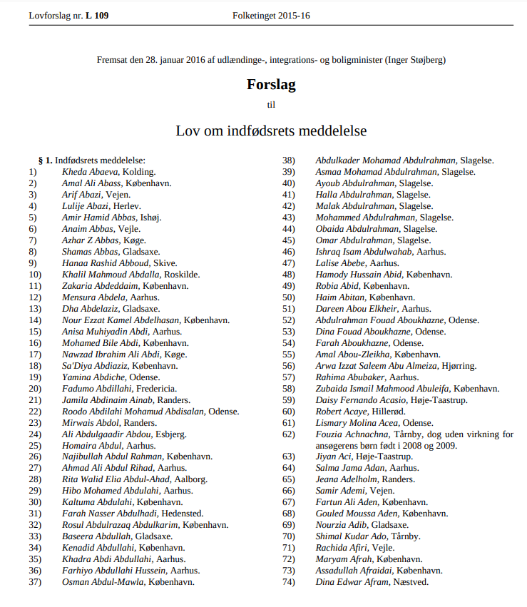 Who's getting Danish 🇩🇰 citizenship? By Danish 🇩🇰 law, everybody who gains it must be granted it thru a special law put into effect every year. Here's a recent one (2015), first page. There's only 1 person with Western name, and it's a Philippine woman. https://www.ft.dk/RIpdf/samling/20151/lovforslag/L109/20151_L109_som_fremsat.pdf …pic.twitter.com/IngH8JJz1A