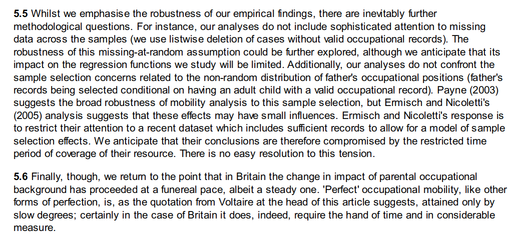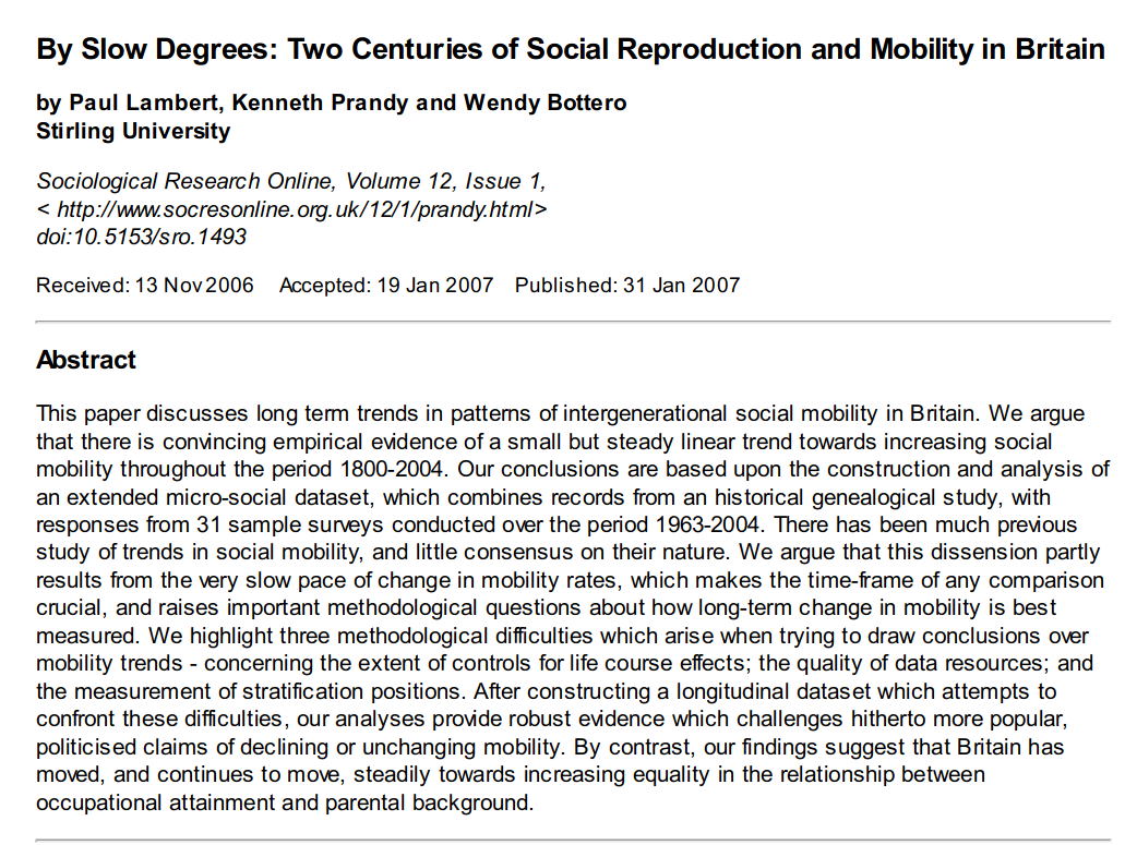 Trends in social mobility in the United Kingdom 1800 to 2000 based on 31 surveys of parent-child data. Decreasing correlates over time, suggesting decreasing family influence or heritability. My main worry is that cors are sensitive to distribution. https://journals.sagepub.com/doi/abs/10.5153/sro.1493 …pic.twitter.com/wOH1slVBRP