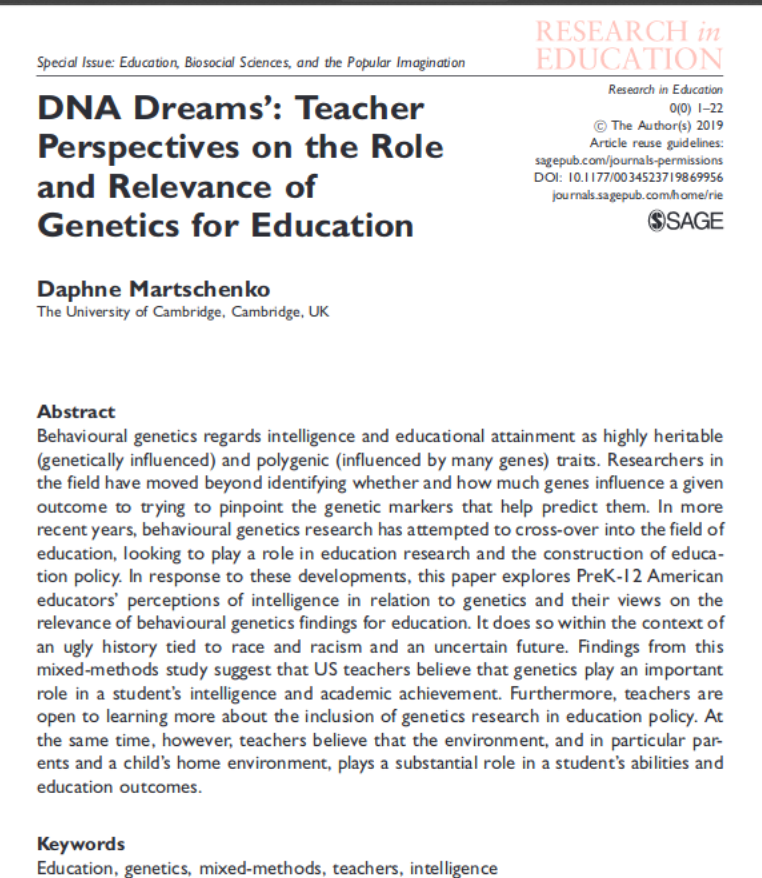 The beliefs of the teachers mentioned in the abstract seem perfectly reasonable. "teachers believe that genetics play an important role in a student's intelligence and academic achievement" and "teachers believe that the (home) environment... plays a substantial role"