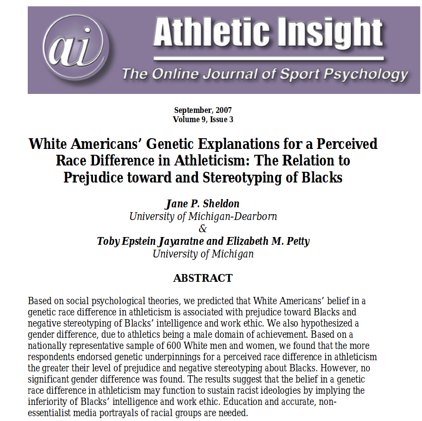 Looks like stereotype accuracy is correlated with belief in genetic causation of race gaps. http://www.athleticinsight.com/Vol9Iss3/RacePDF.pdf …pic.twitter.com/dyONUzu5gO