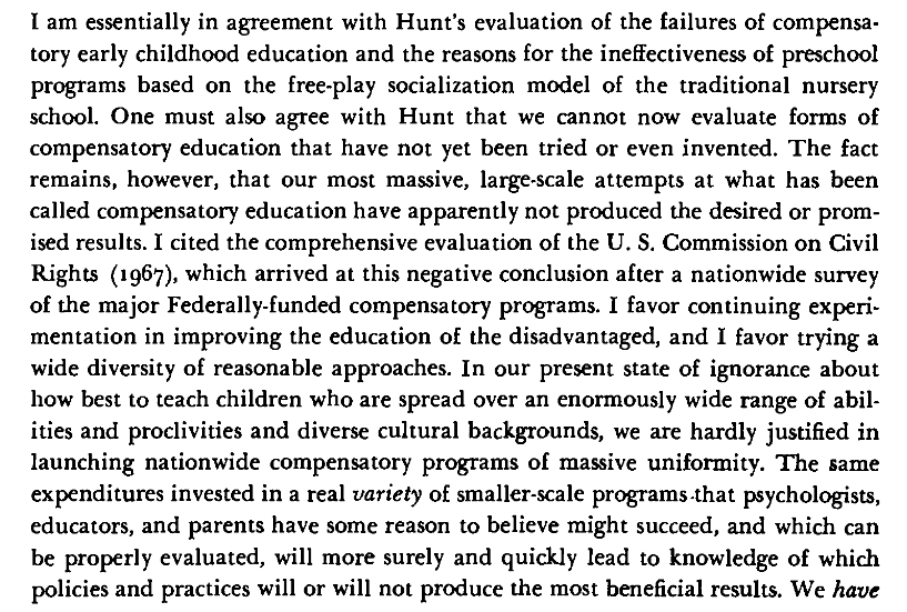 Arthur Jensen on the state of evidence regarding compensatory/early intervention education. Unfortunately, the literature has not improved that much since. Many people cite the same tiny and ancient studies repeatedly while ignoring large failures. http://arthurjensen.net/wp-content/uploads/2014/06/Reducing-the-Heredity-Environment-Uncertainty-A-Reply-1969-by-Arthur-Robert-Jensen.pdf …pic.twitter.com/Ht5VpaUocT