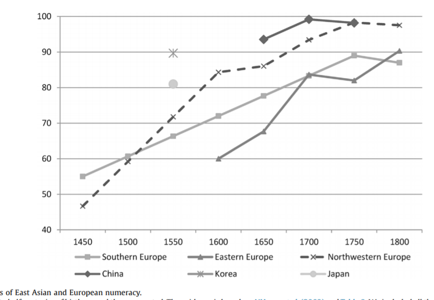 Numeracy levels in early modernity ranked: (1) Korea, Japan, and China (2) NW Europe (3) S and E Europe [not shown (4) other parts of the world] Coincidentally the same ranking as National IQ and PISA scores today.pic.twitter.com/HOyfCQo72d