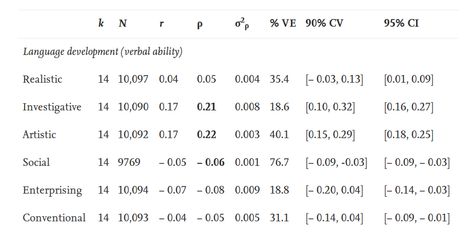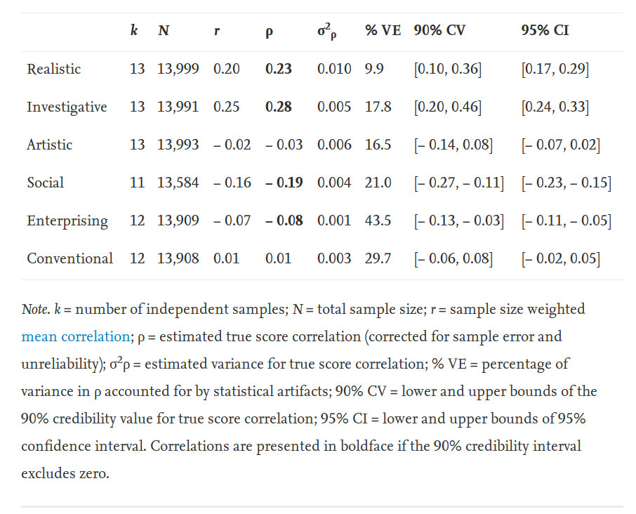 Consistent relationships between vocational interests and cognitive abilities. Having better math and spatial ability is related to liking work in realistic and investigative areas, and opposite for artistic and social. https://www.sciencedirect.com/science/article/pii/S0160289615000197 …pic.twitter.com/rhAkdG1YMK